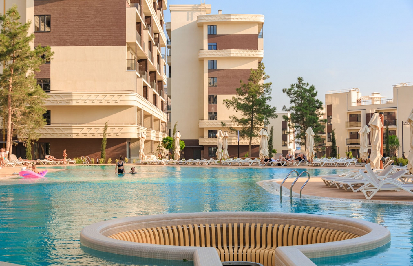 Оборудованный пляж и благоустроенная набережная находятся всего в 30 метрах от комплекса, также есть тренажерный зал, бизнес-пространство и закрытая парковая территория с зонами отдыха, амфитеатром и детскими площадками.