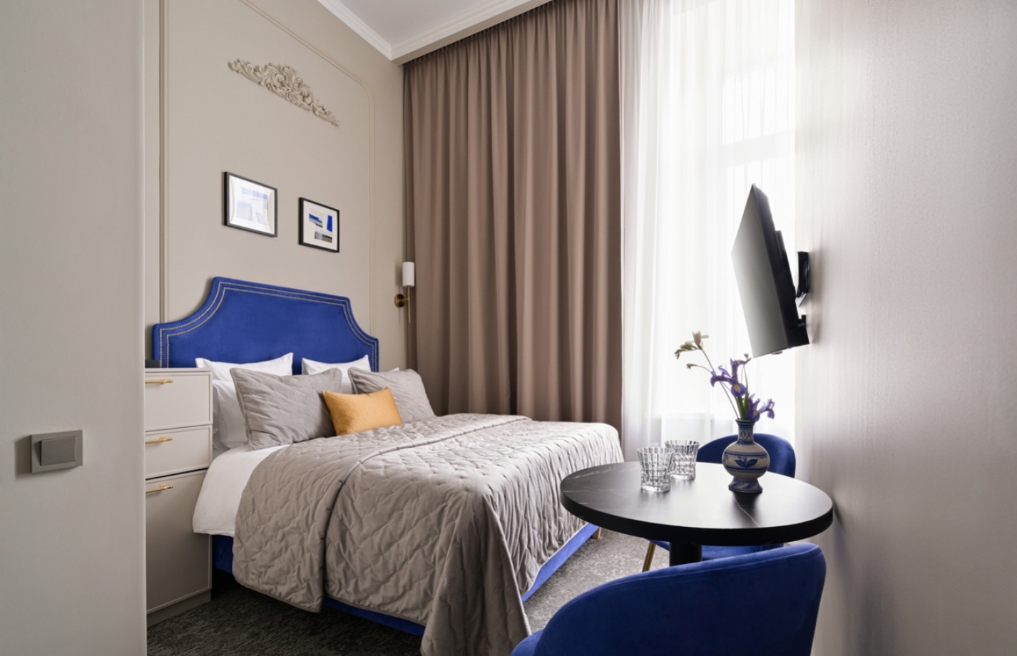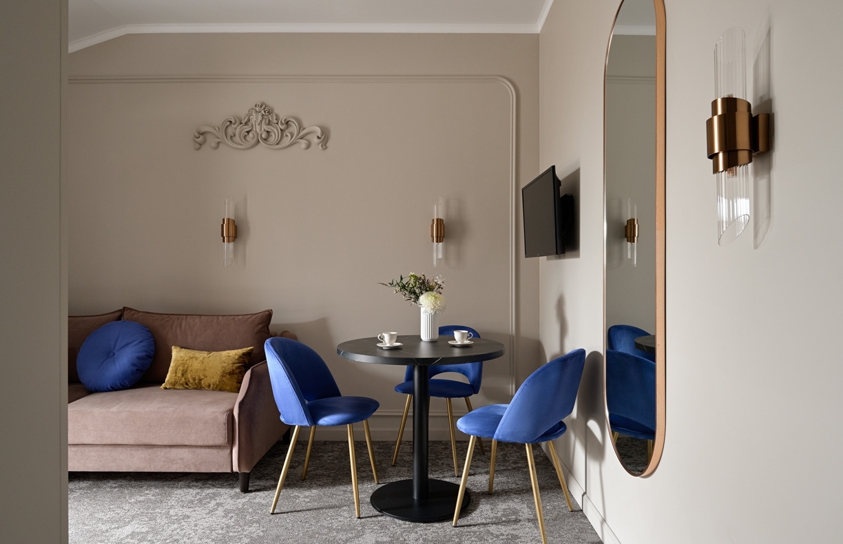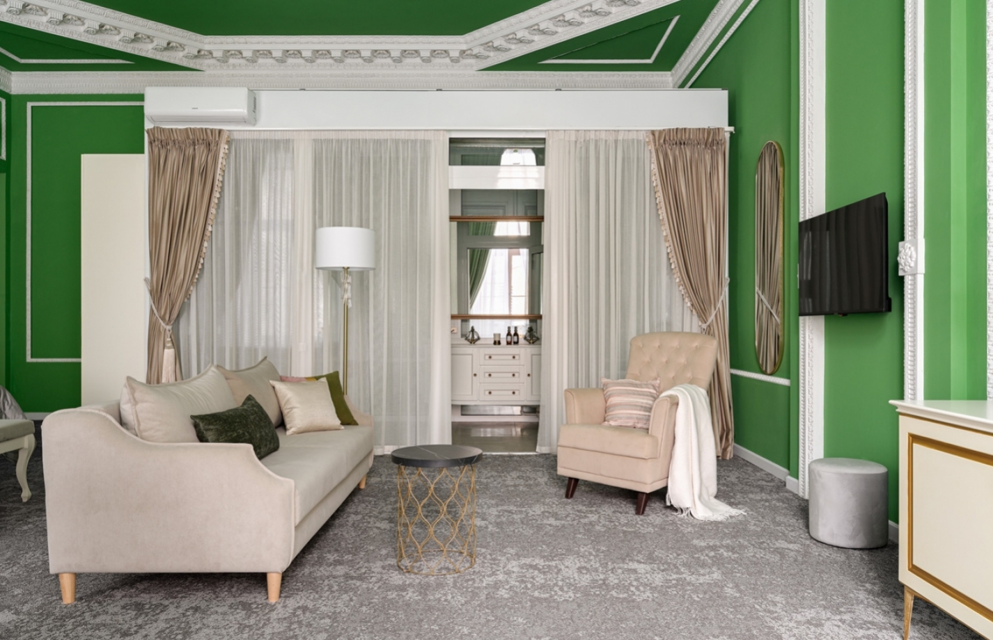 Интерьер номера объединяет неоклассический стиль с современным комфортом и держит тонкий баланс между эстетикой и функциональностью. Изящные детали отделки погружают в историю и создают настроение, а современное оснащение номера обеспечивает удобство во всех важных мелочах.