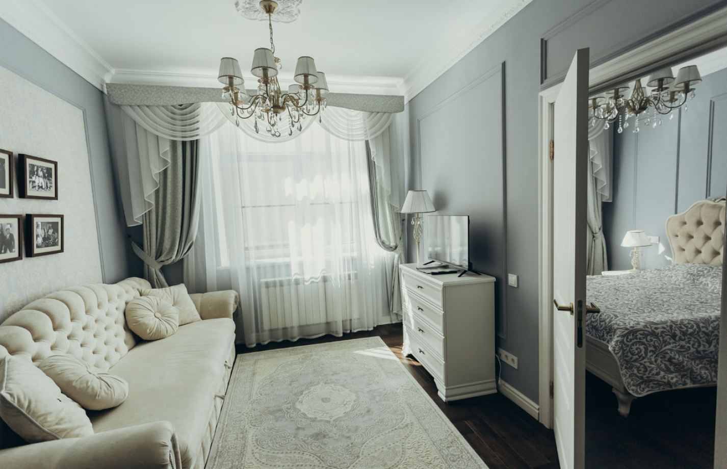 Номер Шенкер – двухкомнатный номер с двухспальной кроватью, диван, кухня.