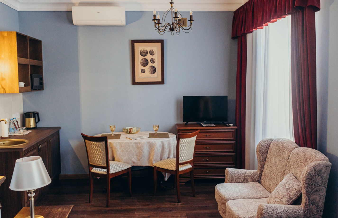 Номер Сигсон выполнен в голубых тонах, с двухспальной кроватью, диван, кресло, кухня, окна выходят во двор.