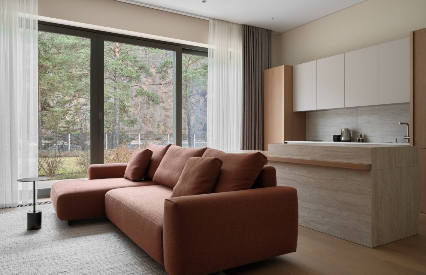 Для размещения гостей предусмотрены одноэтажные и двухэтажные виллы на первой и второй береговой линии с видом на реку, сад и горы, с размещением от двух до восьми человек: дома с панорамным остеклением стирают границу между интерьером и пейзажем, создавая эффект полного погружения в природу.