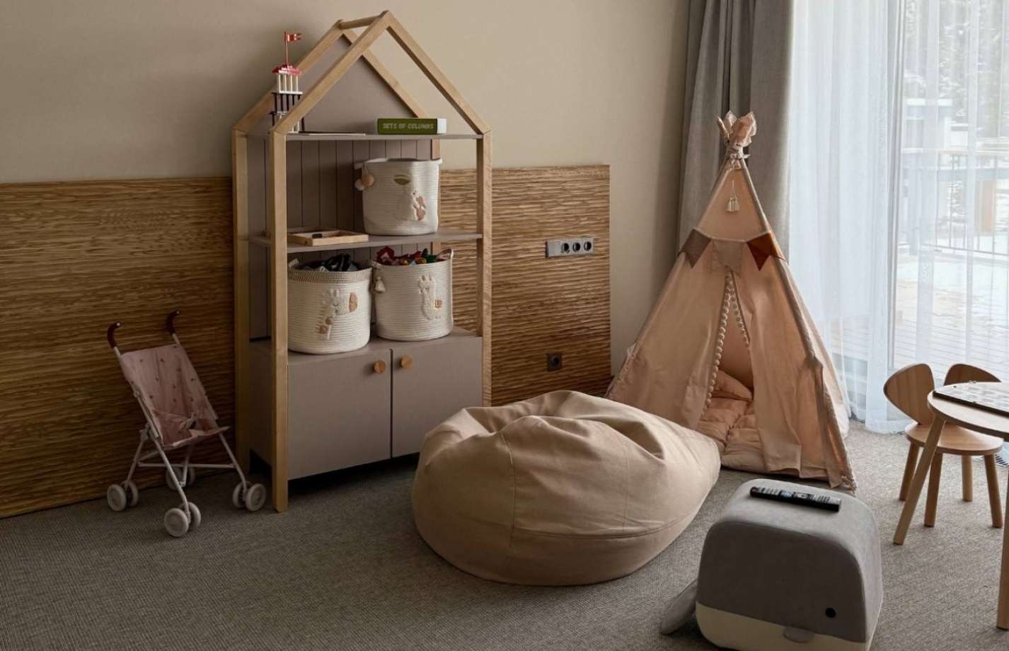 Детская площадка с качелями и горками, крытая детская комната, детский клуб, няня, детское меню в ресторане, возможность участия в мастер-классах.