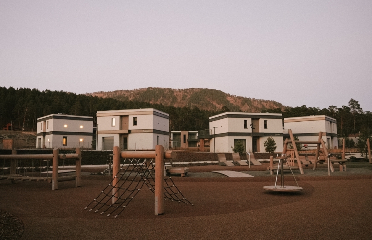 Двухэтажные дома 153м² располагаются на возвышенности и образуют большую благоустроенную территорию. Внутри круглой застройки образуется своя уединенная атмосфера с видом на сад. Часть домов этого типа имеет гараж, а часть — дополнительную спальню. У каждого дома есть терраса с навесом и 2 балкона. Комфортное размещение 4-6 гостей.