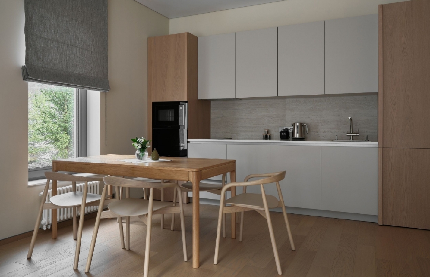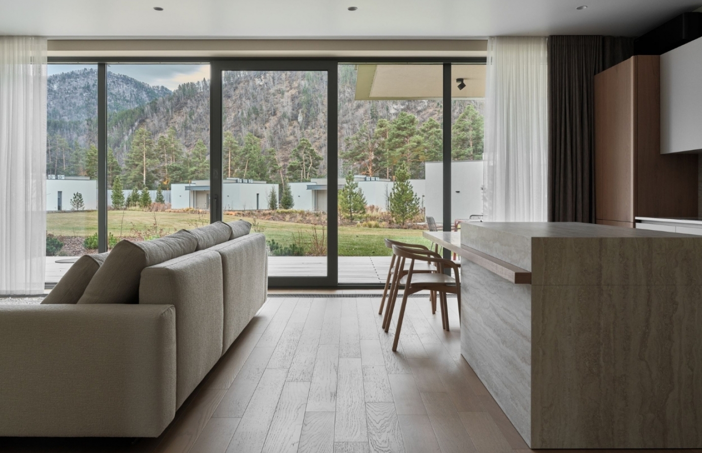 Дома первой и второй береговой линии: одноэтажные и двухэтажные, площадью от 90 до 200 м², с панорамными окнами и террасами, из которых открываются виды на горы, реку и грушевый сад. Каждый дом оснащён современной техникой, укомплектован дизайнерской мебелью, имеет полностью оборудованную кухню, спальни с кроватями king-size и функциональные гостиные.