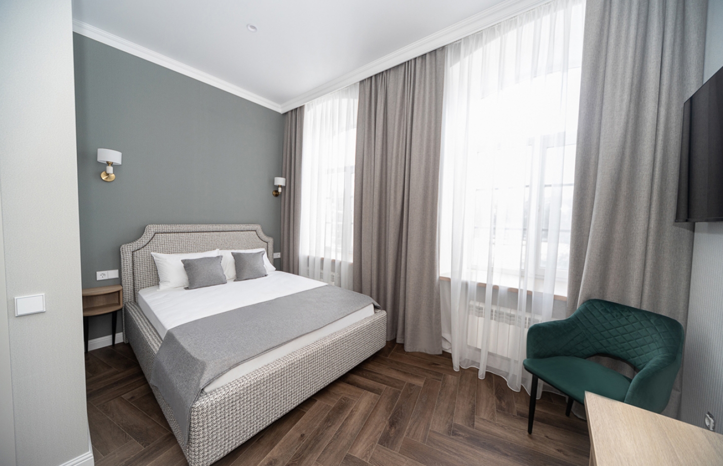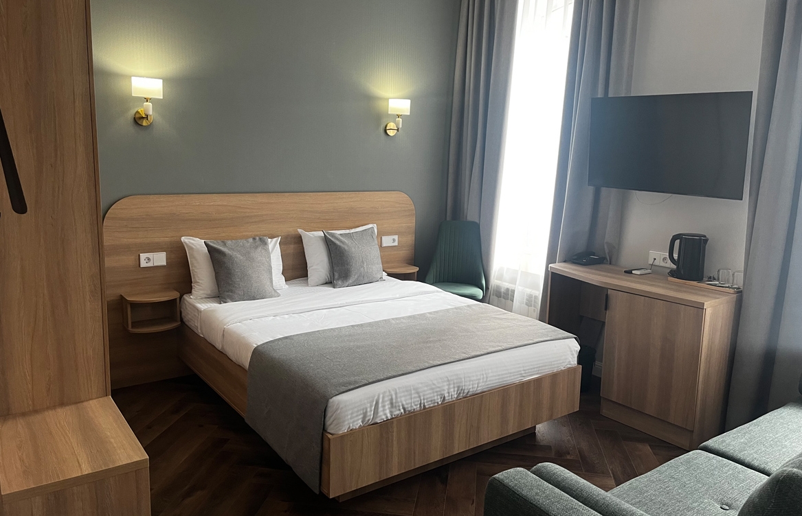 Оптимальное сочетание цены и качества. Номера оформлены стильном дизайне, обеспечивая комфорт и уют для гостей. В номере есть все необходимые удобства, удобная кровать, рабочий стол, чайная станция, ТV, сплит система, холодильник. Ванная комната укомплектована всем необходимым: полотенца, одноразовые средства гигиены, фен. Это идеальный выбор для путешественников, которые ищут доступное жилье в центре города, не жертвуя при этом комфортом.