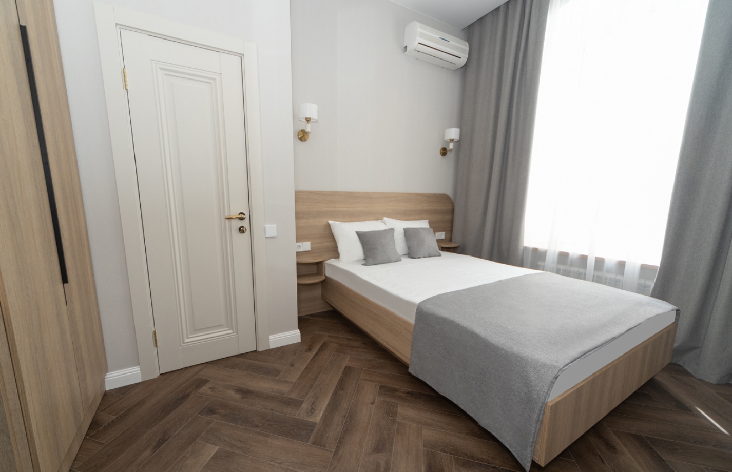 Гармоничное сочетание комфорта и стиля. Просторный и светлый, этот номер оформлен в современном дизайне с элементами классики, создавая уютную атмосферу для отдыха. В номере предусмотрены удобная кровать, рабочая зона, телевизор, холодильник, чайная станция, сплит-систем. Ванная комната укомплектована всем необходимым: полотенца, одноразовые средства гигиены, фен. Номера "Стандарт" идеально подходят как для деловых поездок, так и для туристов, желающих насладиться атмосферой города.