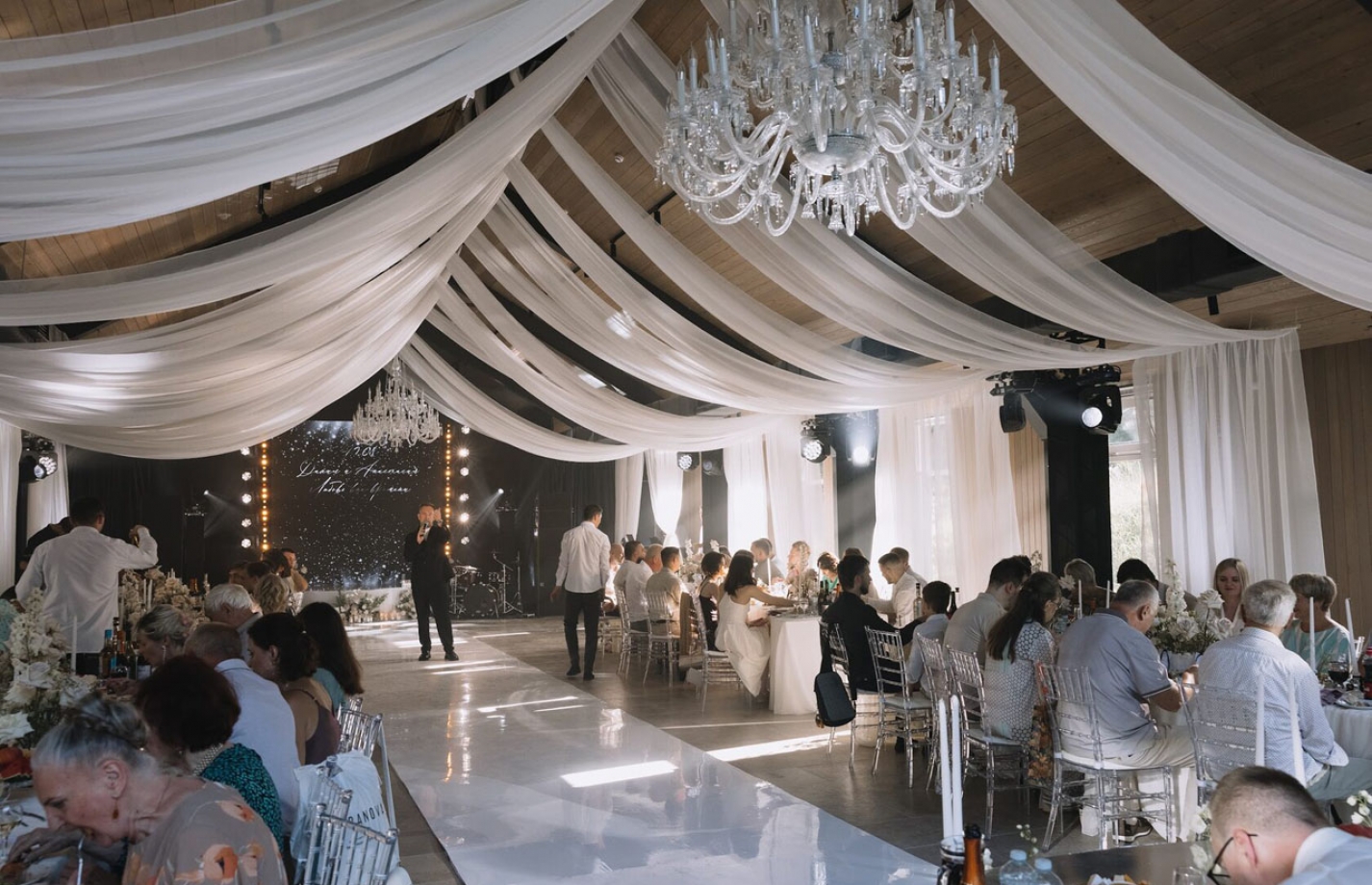 Шатер «Усадьба» вмещает до 180 гостей, что позволяет организовать свадьбу любого формата — от семейного торжества до грандиозного праздника. Площадь в 200 кв. м создает комфортные условия для всех гостей и позволяет стильно зонировать пространство. В шатре установлены элегантные круглые столы и стулья Chiavari, придающие мероприятию утонченность и роскошь.