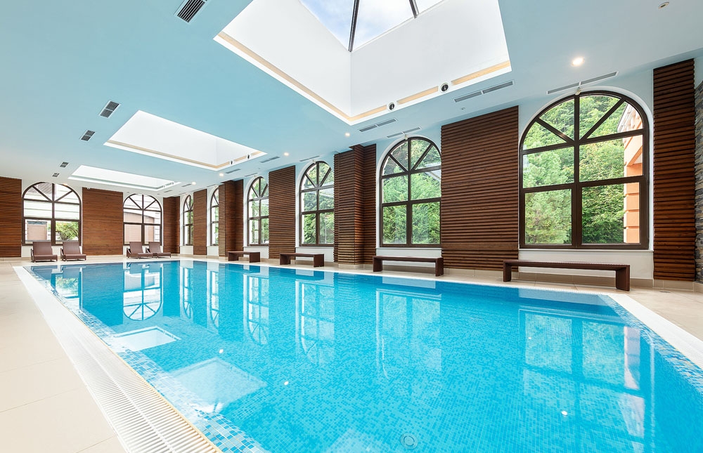 Единственный на курорте Роза Хутор (уровень 560 м) SPA-центр с бассейном 15*5 метров под стеклянными куполами и просторными витражами с видом на лес;