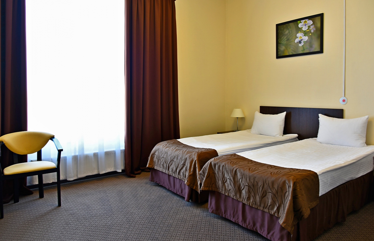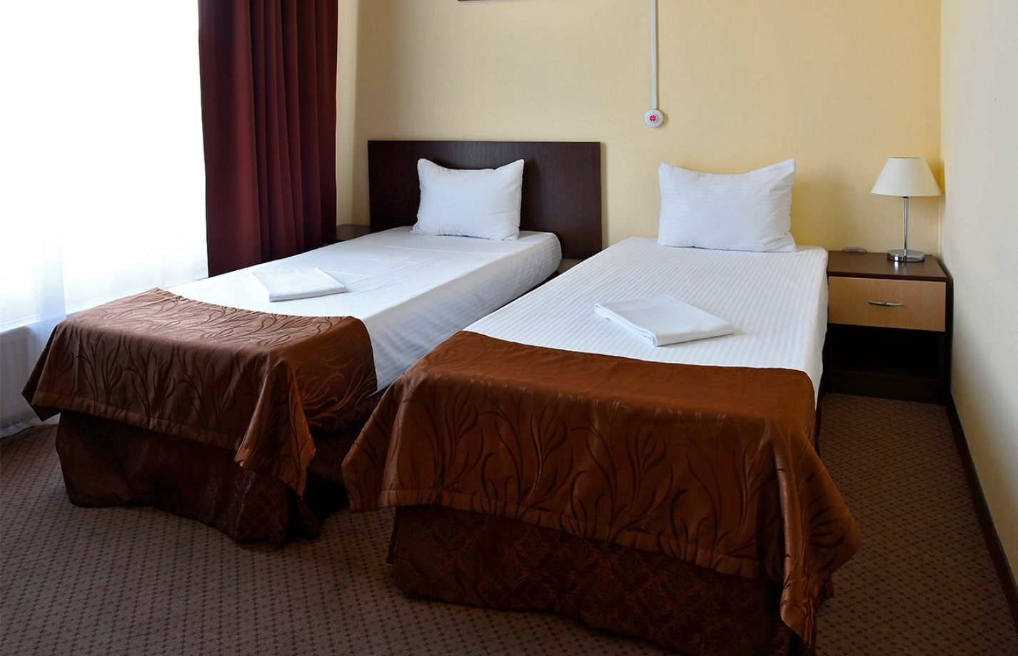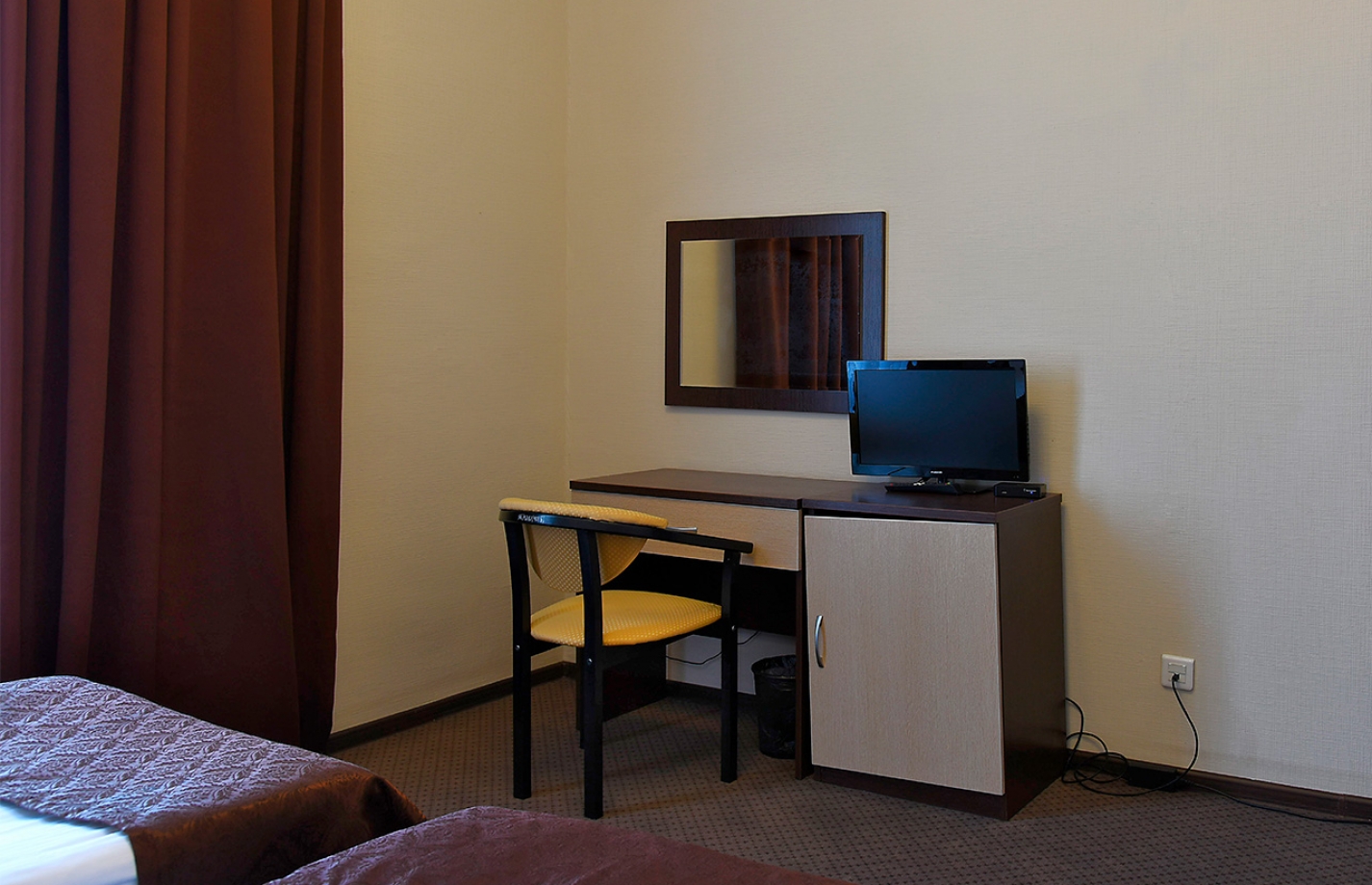 Прекрасный вариант для проживания туристических групп и индивидуальных путешественников. Для деловых поездок предусмотрена эргономичная рабочая зона. В номере данной категории: две раздельно стоящие кровати размером 900*2000 мм (по запросу возможно трансформировать две односпальные кровати в одну двуспальную), новая функциональная мебель, телевизор, телефон, индивидуальная система кондиционирования, сейф, чайник, мини-бар. Мини-бар предназначен для охлаждения напитков. Санузел совмещен с ванной, оснащен феном. Минимальное количество номеров включает в себя лоджию/балкон. В зависимости от проекта и планировки, возможно видоизменение номера, как в комплектации, так и в оформлении. * Под запрос возможно установить дополнительно место (раскладушка)