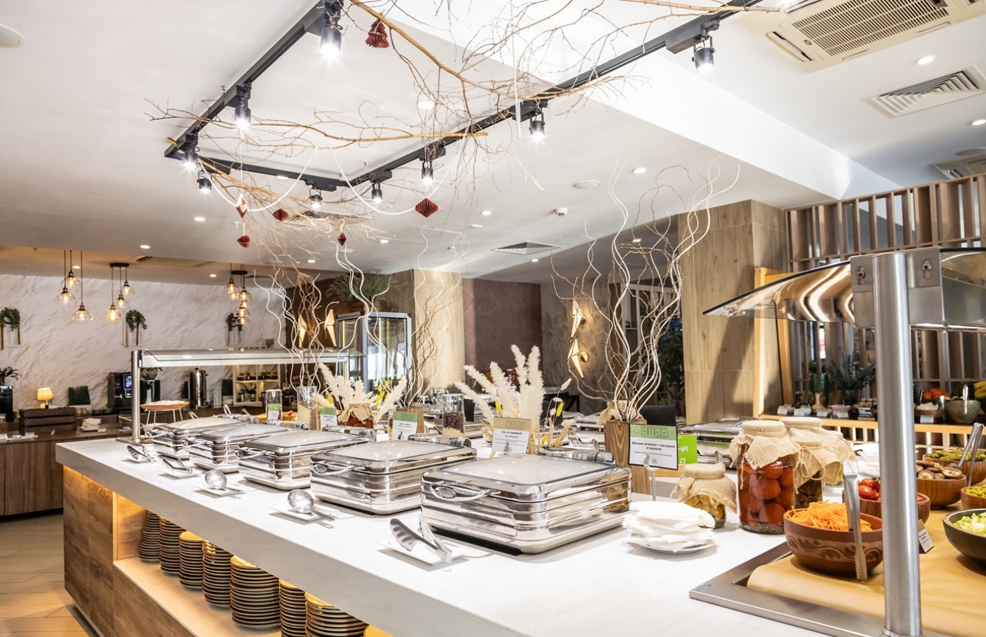 «Эдельвейс» расположен на третьем этаже отеля, работает в формате «шведский стол».