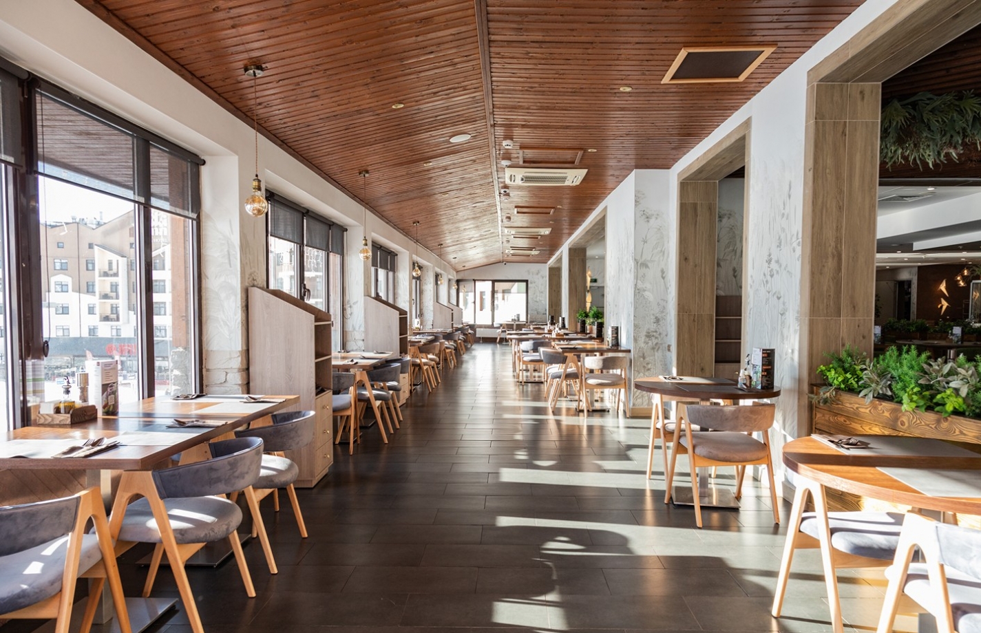 Из окон ресторана открывается великолепный вид на хребет Аибга и горнолыжные склоны.