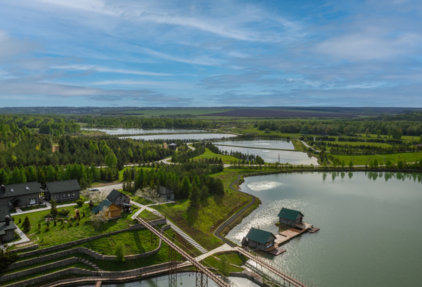 На территории комплекса можно встретить постоянных обитателей леса – цапель, бобров, ондатр и зайцев – природа здесь живёт и развивается вместе с нами. А на собственной ферме выращивают экологически чистые овощи и фрукты, есть форелевое хозяйство и пасека, что подтверждает наш подход к экологической ответственности и заботе о здоровье.