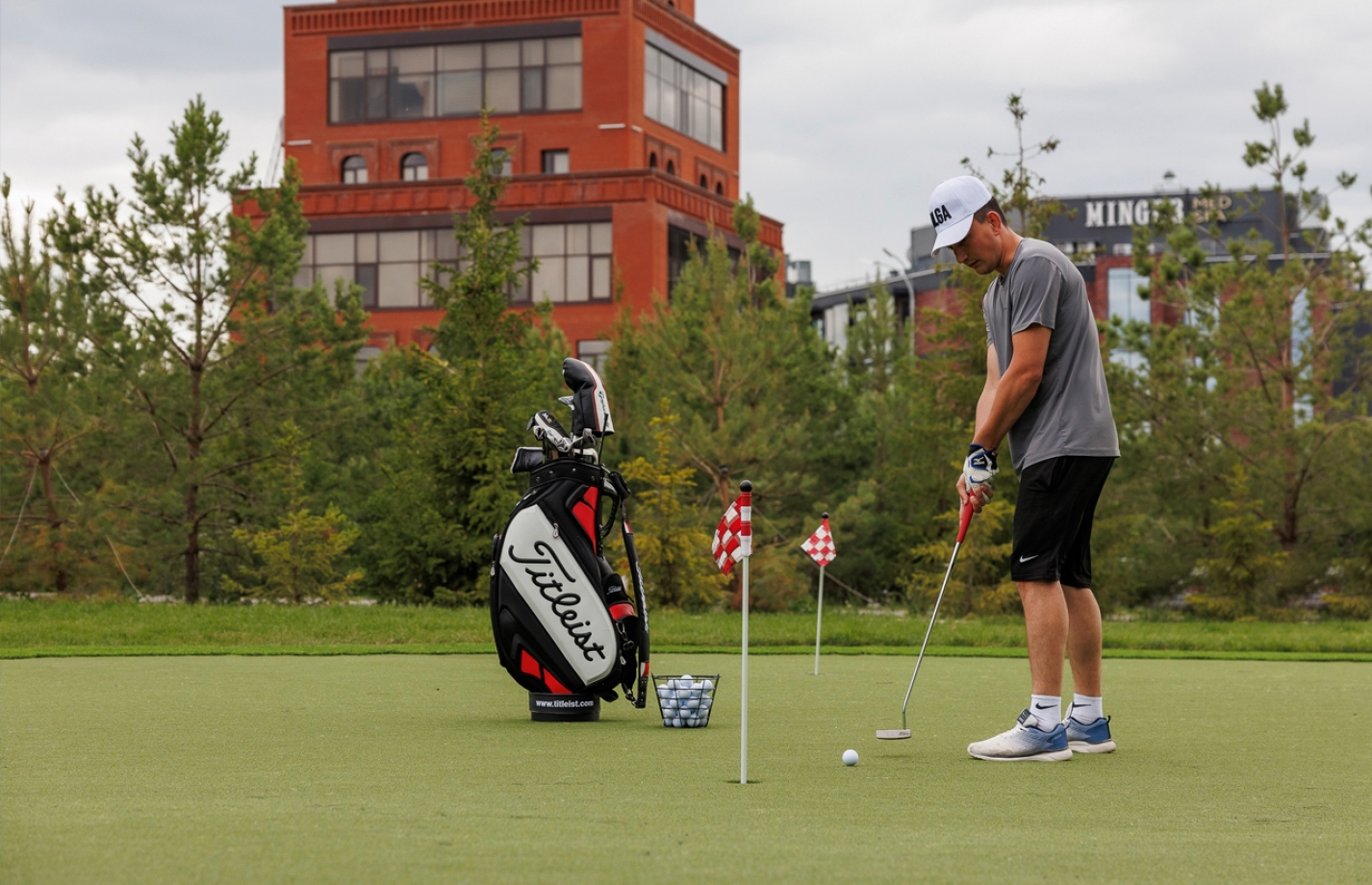 Потренируйте силу удара и меткость на искусственном гольф-поле с профессиональным снаряжением.