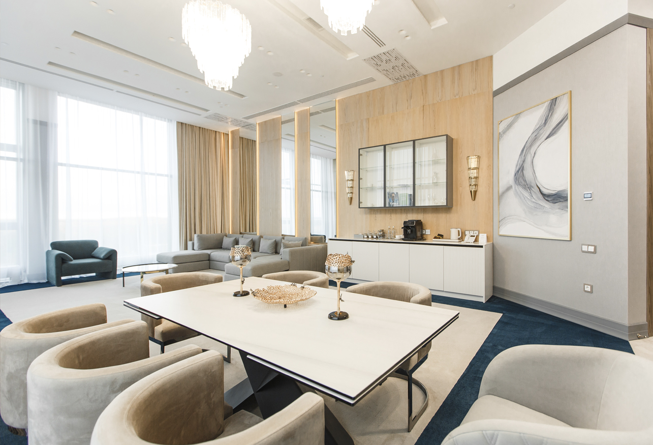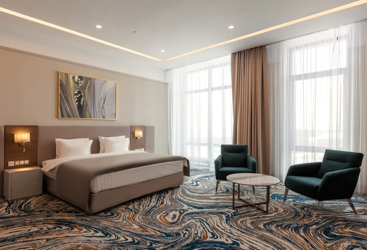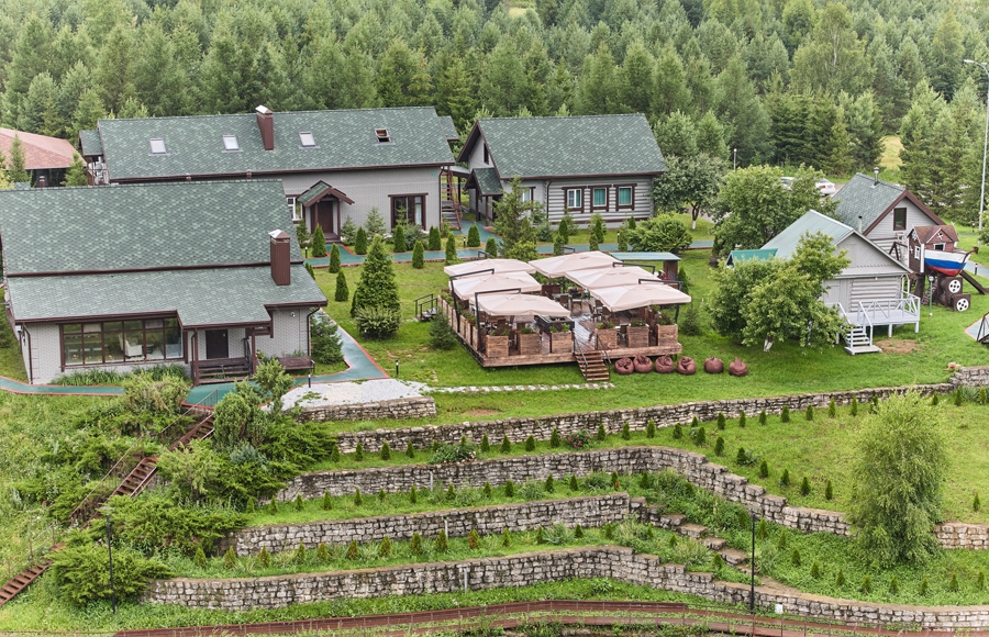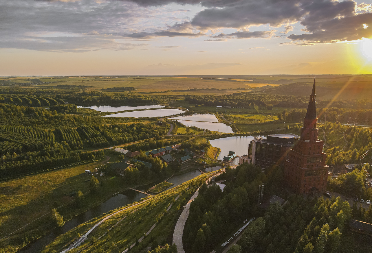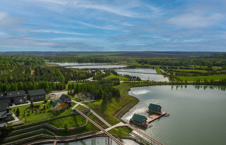 - 5-звездочный отель с номерами, остеклёнными панорамными окнами, выходящими прямо на лес или озёра, создавая ощущение единения с природой. Вокруг отеля расположены аллея памяти, уютные парки, террасы и зоны отдыха, где гости могут спокойно прогуливаться и наслаждаться природой.