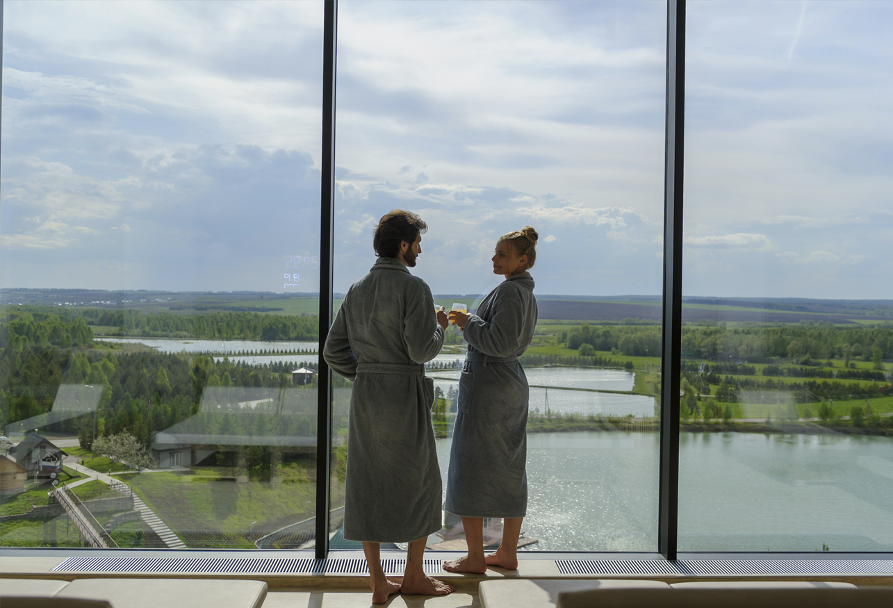 Все окна в номерах, ресторане и спа-центре выполнены в панорамном остеклении. Благодаря этому гости могут наслаждаться видом на леса, озёра и окружающую природу прямо из своего уютного пространства, что создает приятную атмосферу и помогает полностью расслабиться.