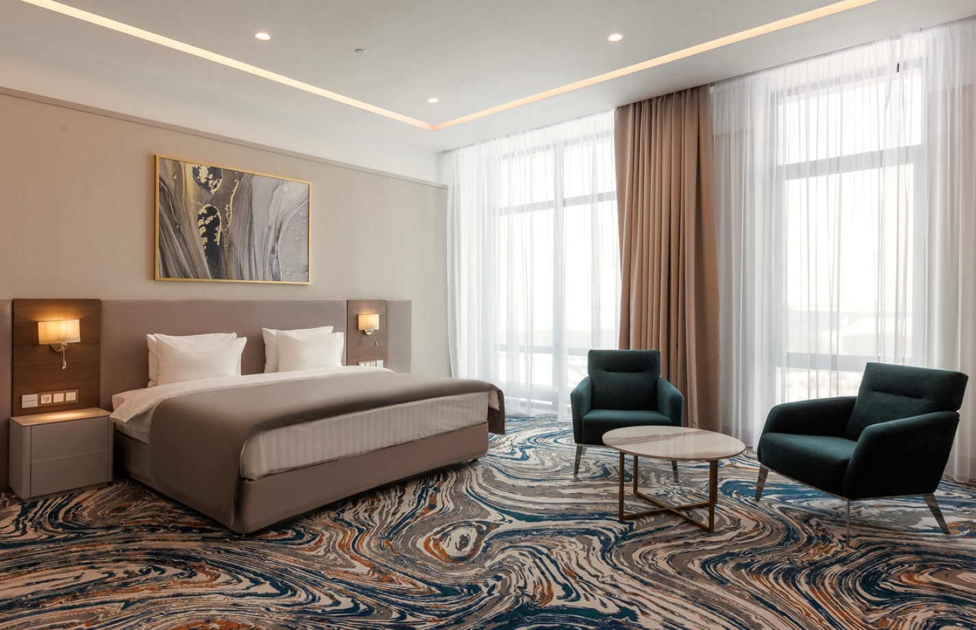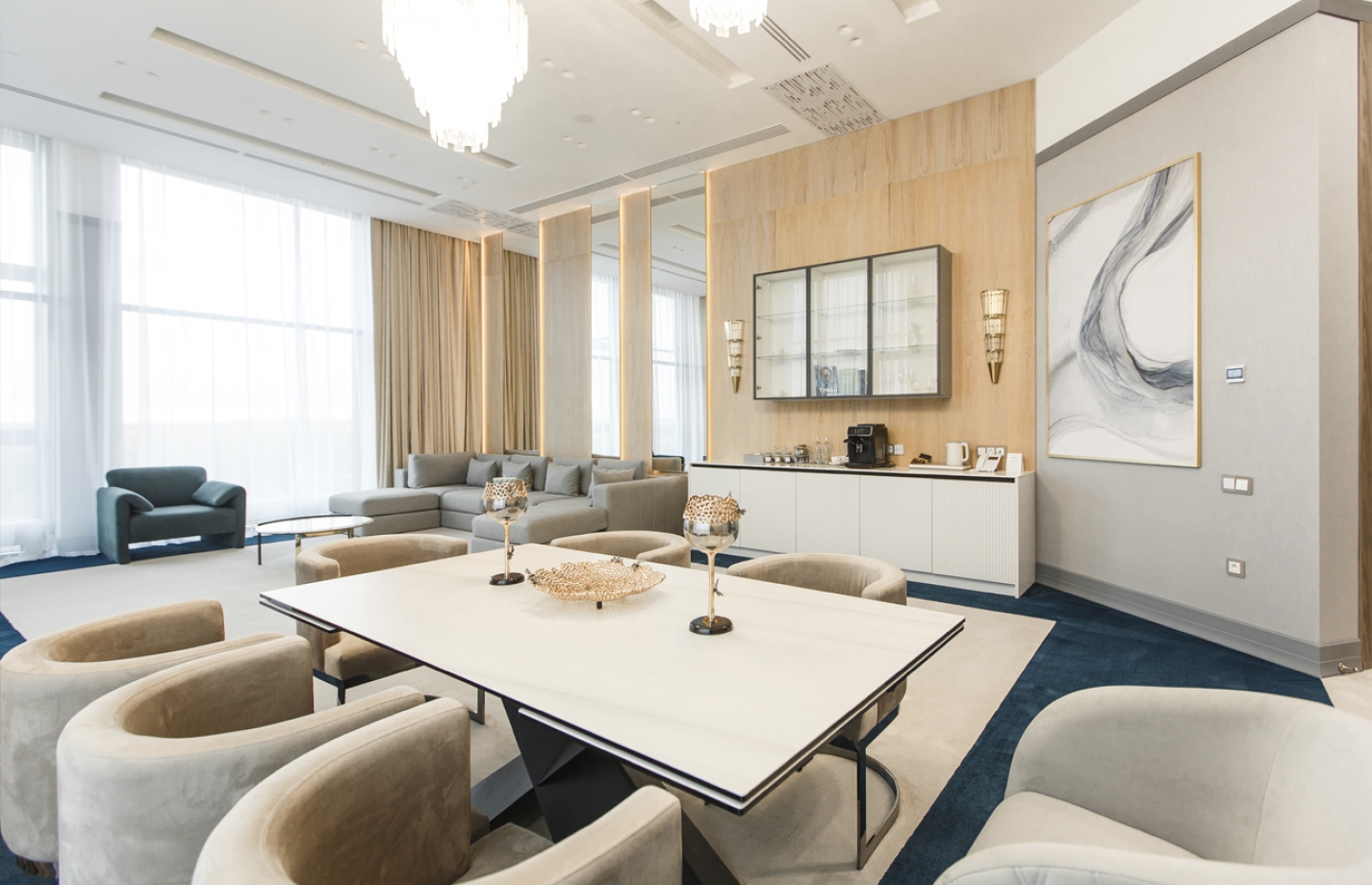 Номерной фонд – 40 номеров от комфорта до президентского люкса с авторским дизайном в природных оттенках из эксклюзивных материалов.
