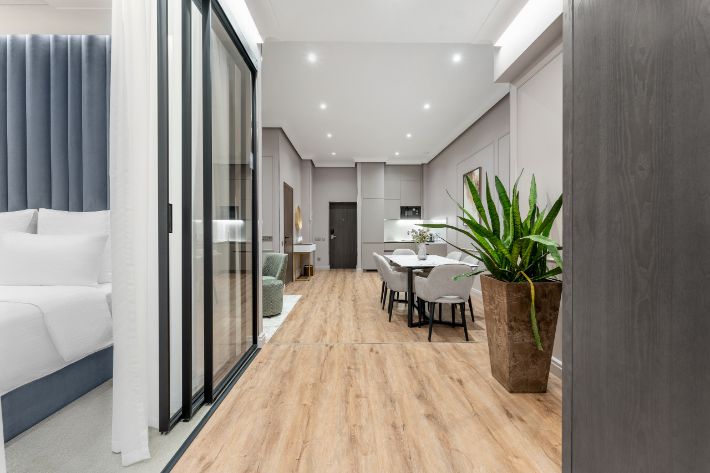 Просторный Люкс площадью 85 кв. м. станет уютным местом отдыха для большой семьи или компании друзей. Номер данной категории имеют всё необходимое пространство для комфортного размещения: две спальни с двуспальными кроватями, кухня-гостиная, гардеробная, оборудованная ванная комната.