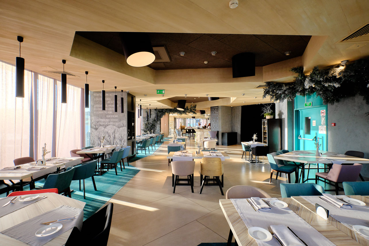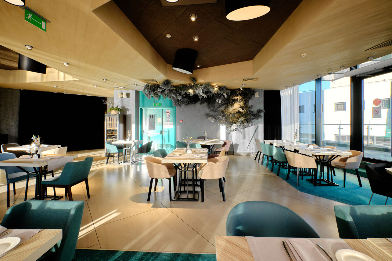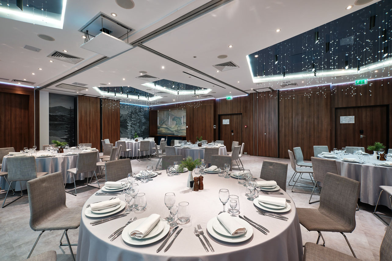 Самый большой конференц-зал отеля является трансформером: пространство легко делится на два полноценных зала с независимой акустикой, позволяя проводить параллельно несколько мероприятий.