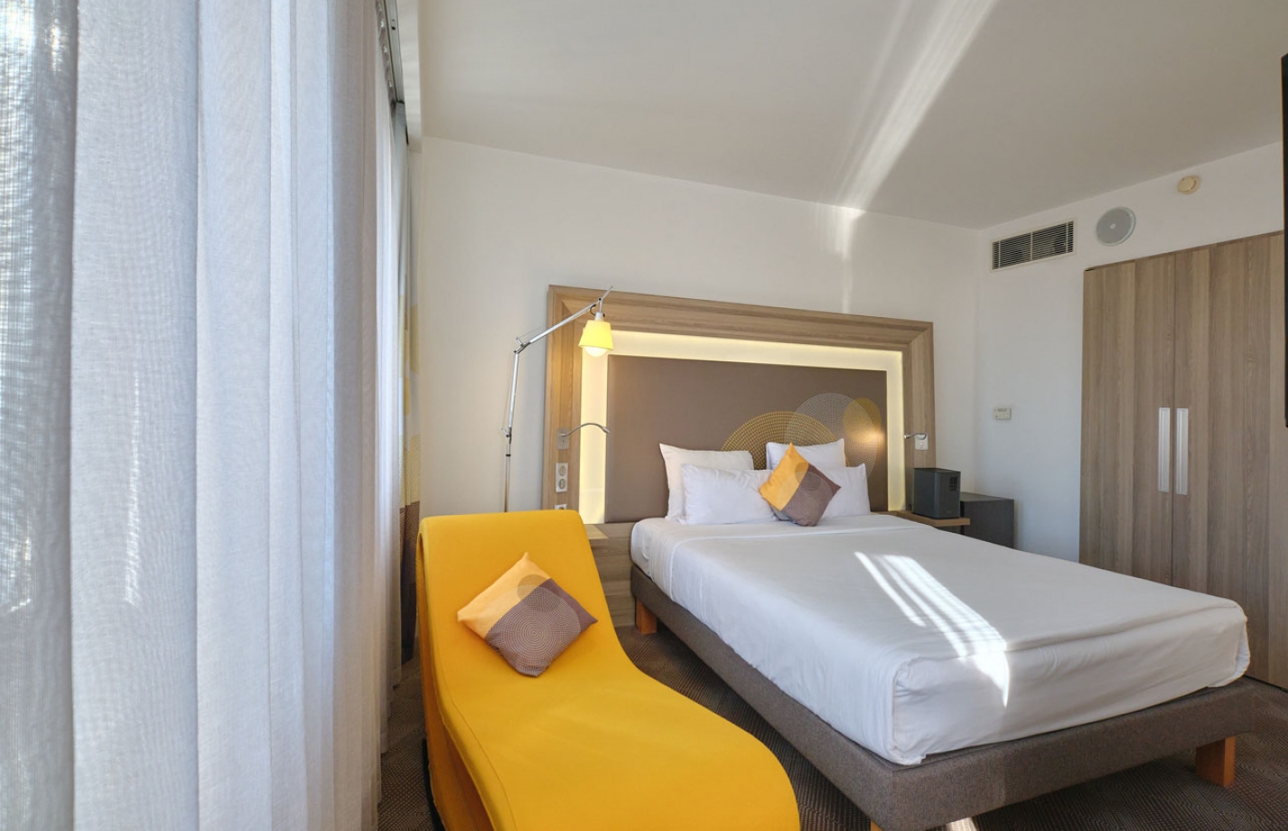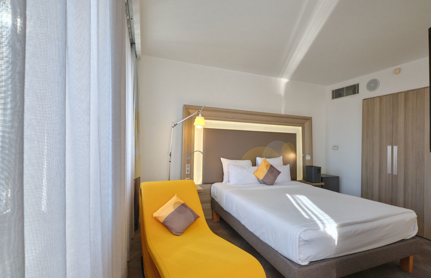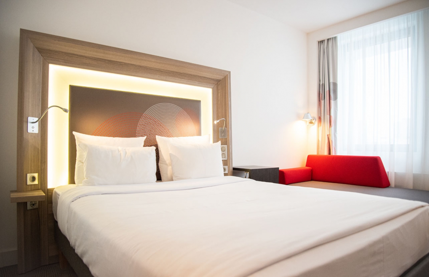 Номер Family с двуспальной кроватью и софой – в номере представлено все для комфортного пребывания: двуспальная кровать, рабочая зона, ванная комната с душевой кабиной, сейф, кондиционер, холодильник, фен и дополнительное спальное место. Для маленьких гостей по запросу предоставляется детская кроватка, стульчик для кормления, подогреватель бутылочек.