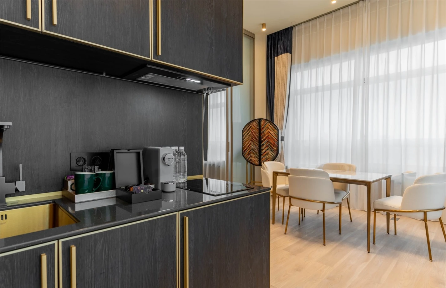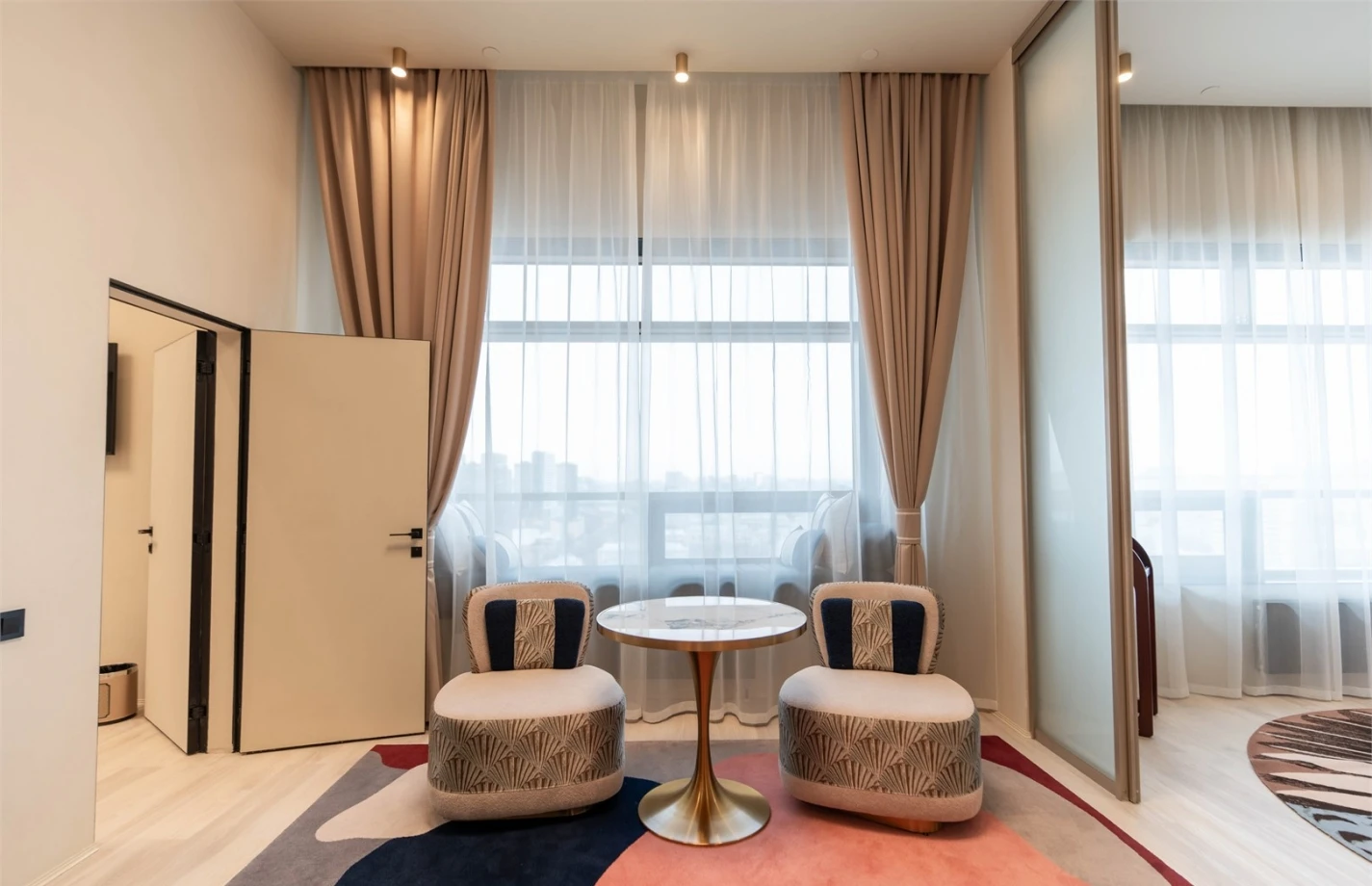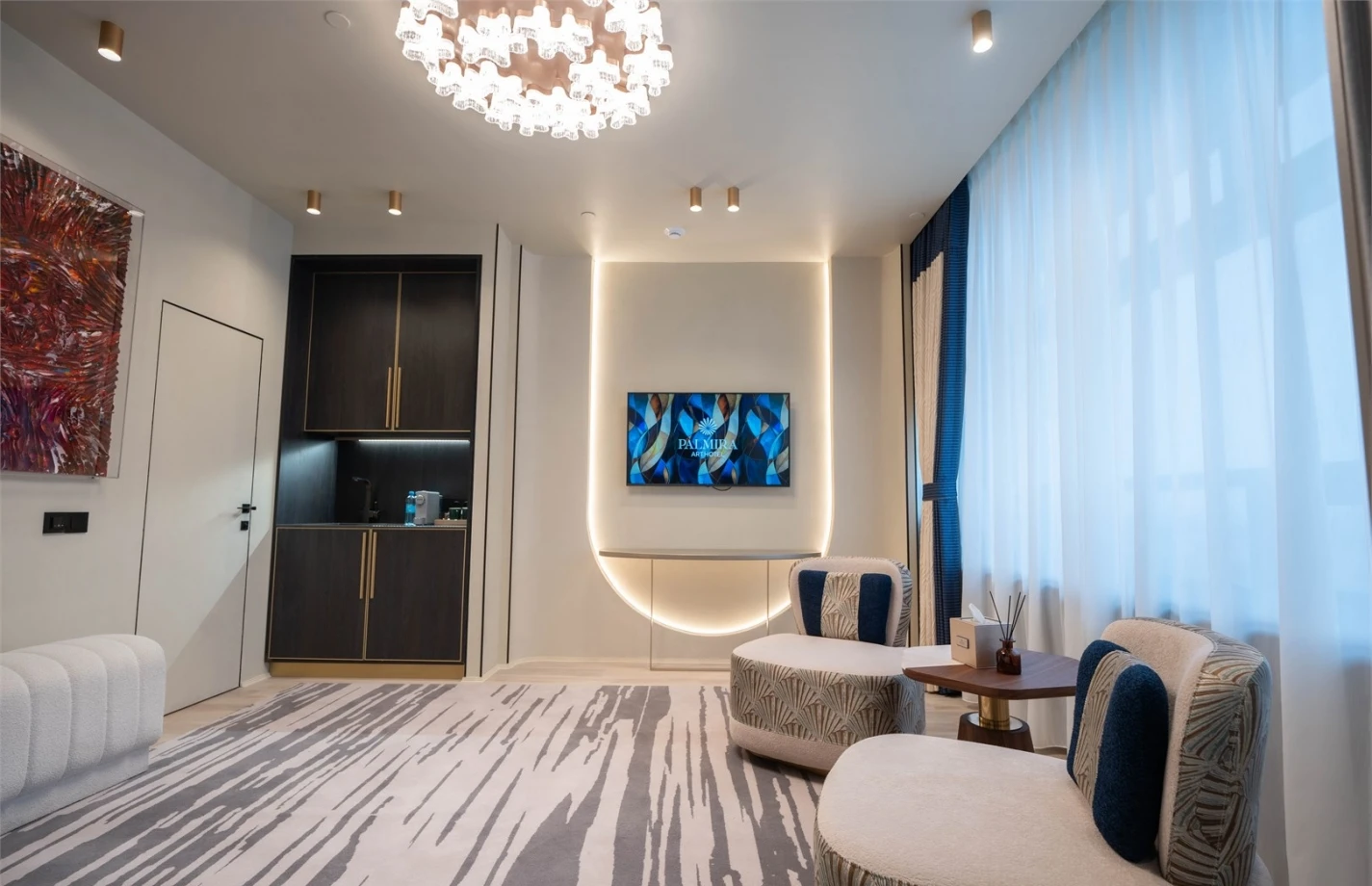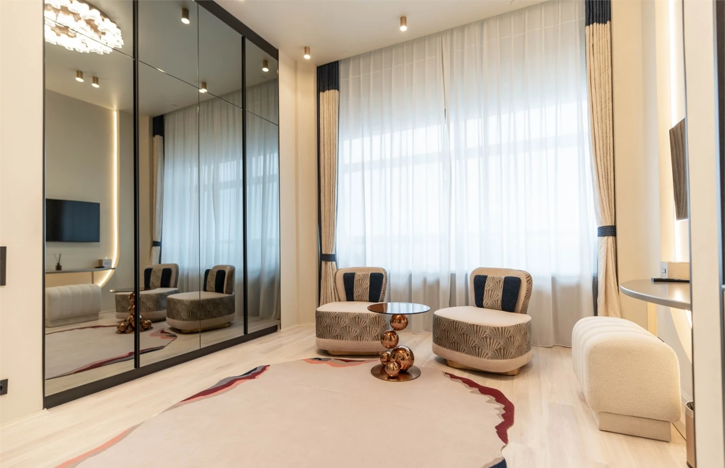Площадь — 143 м². Шесть комнат, две спальни с собственными ванными, две гостиные, кухонная зона. Этот Люкс с панорамными видами на город с 17-го этажа – идеальное сочетание элегантности и комфорта для тех, кто ценит высочайший уровень отдыха.