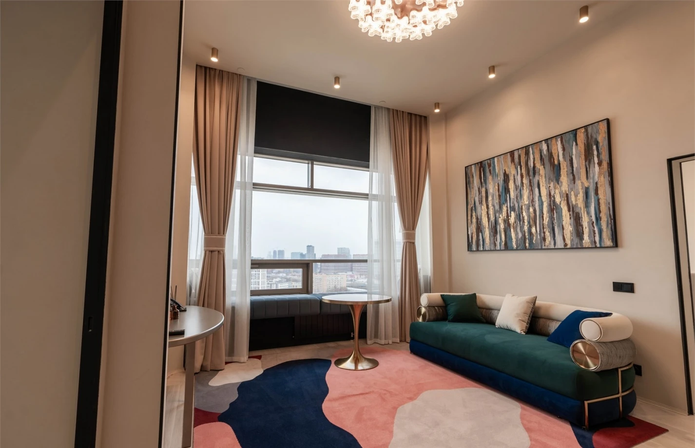 Площадь — 23 м². Главная изюминка – захватывающий вид на Москва-Сити. Комфортабельное пространство для отдыха с мягкой софой у окна, кондиционером и всеми важными мелочами, чтобы восстановить силы и насладиться панорамой.