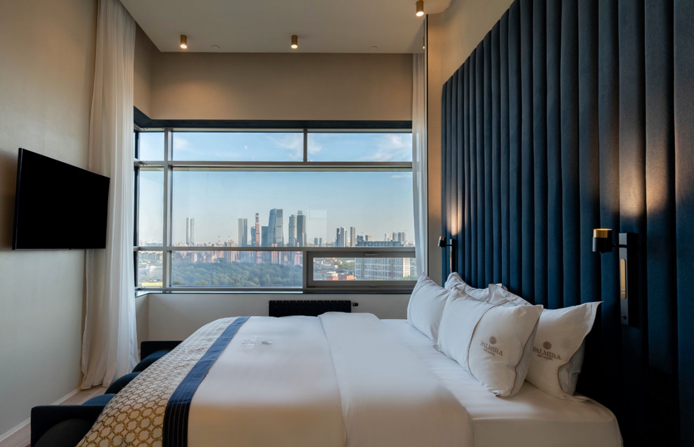 В отеле 225 номеров восьми категорий — от уютных Стандартов до просторного Президентского Люкса с панорамным видом на Москва-Сити.