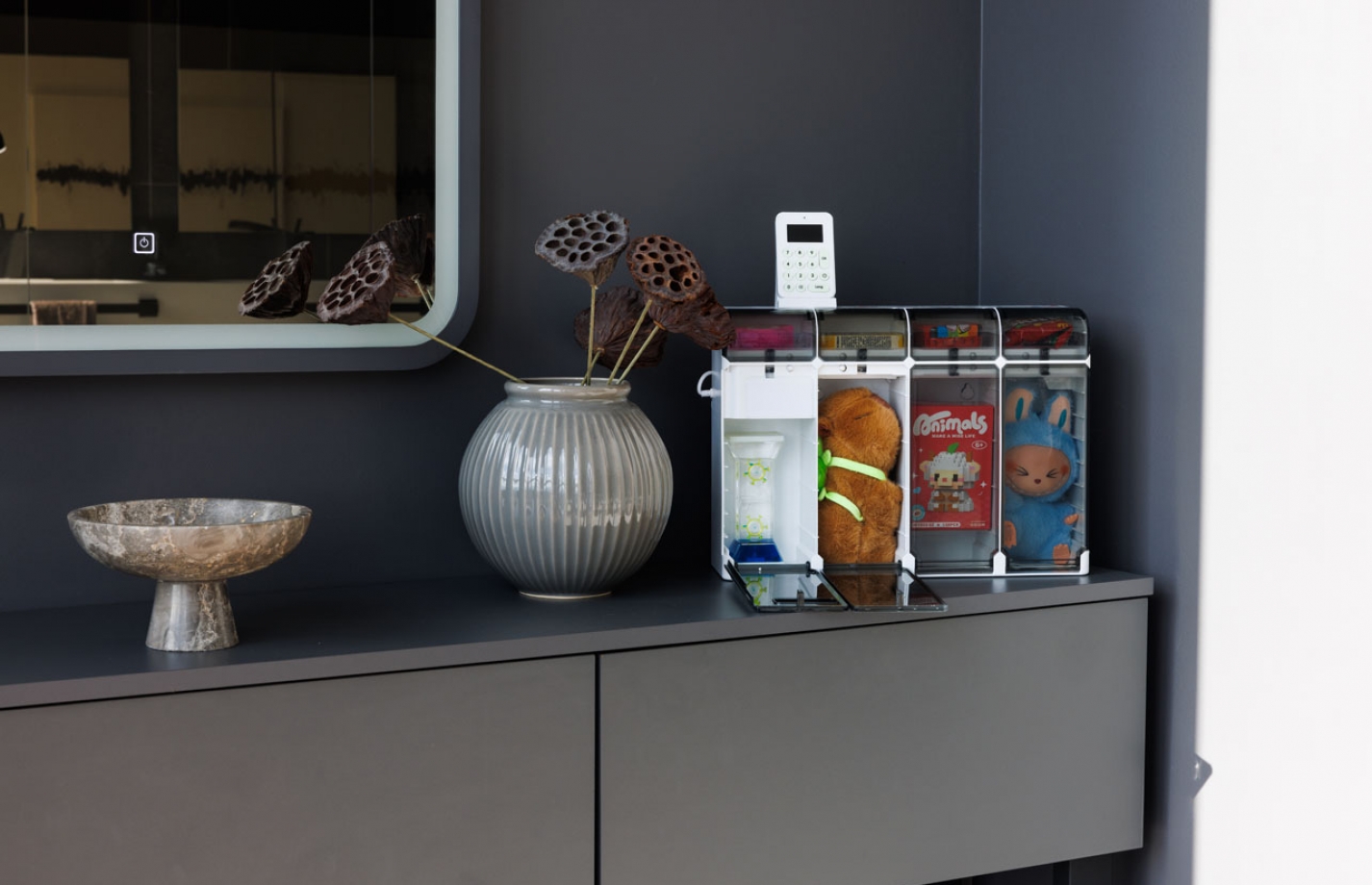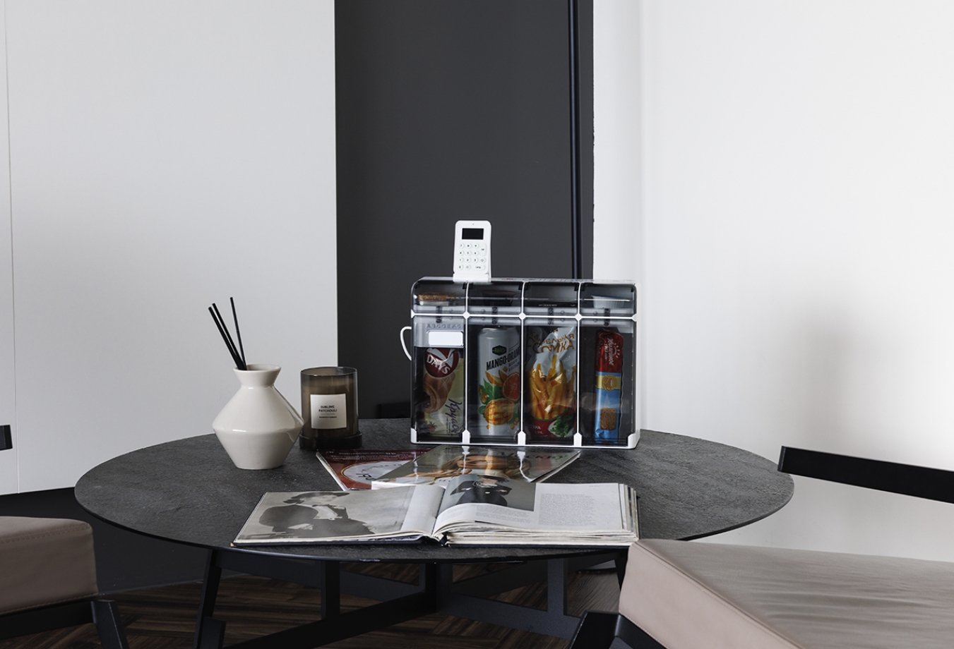 С начала 2025 года наша компания активно развивает сеть мини-вендинговых аппаратов - устройств, предназначенных для продажи любой продукции, от напитков и снеков до детских игрушек и предметов личной гигиены. Аппараты устанавливаются в каждый номер отеля, что позволяет предоставить данную услугу всем постояльцам.