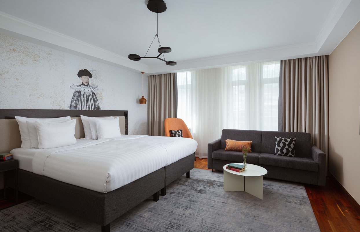 Креативный люкс – одно из главных произведений интерьерного искусства в арт-отеле Vasilievsky. Интерьер номера был разработан совместно с петербургским дизайнером Алиной Игошиной. В оформлении использованы материалы российских креативных брендов, а главным акцентом стал оригинал картины современной художницы Валерии Сальниковой, приобретенный на благотворительном аукционе.