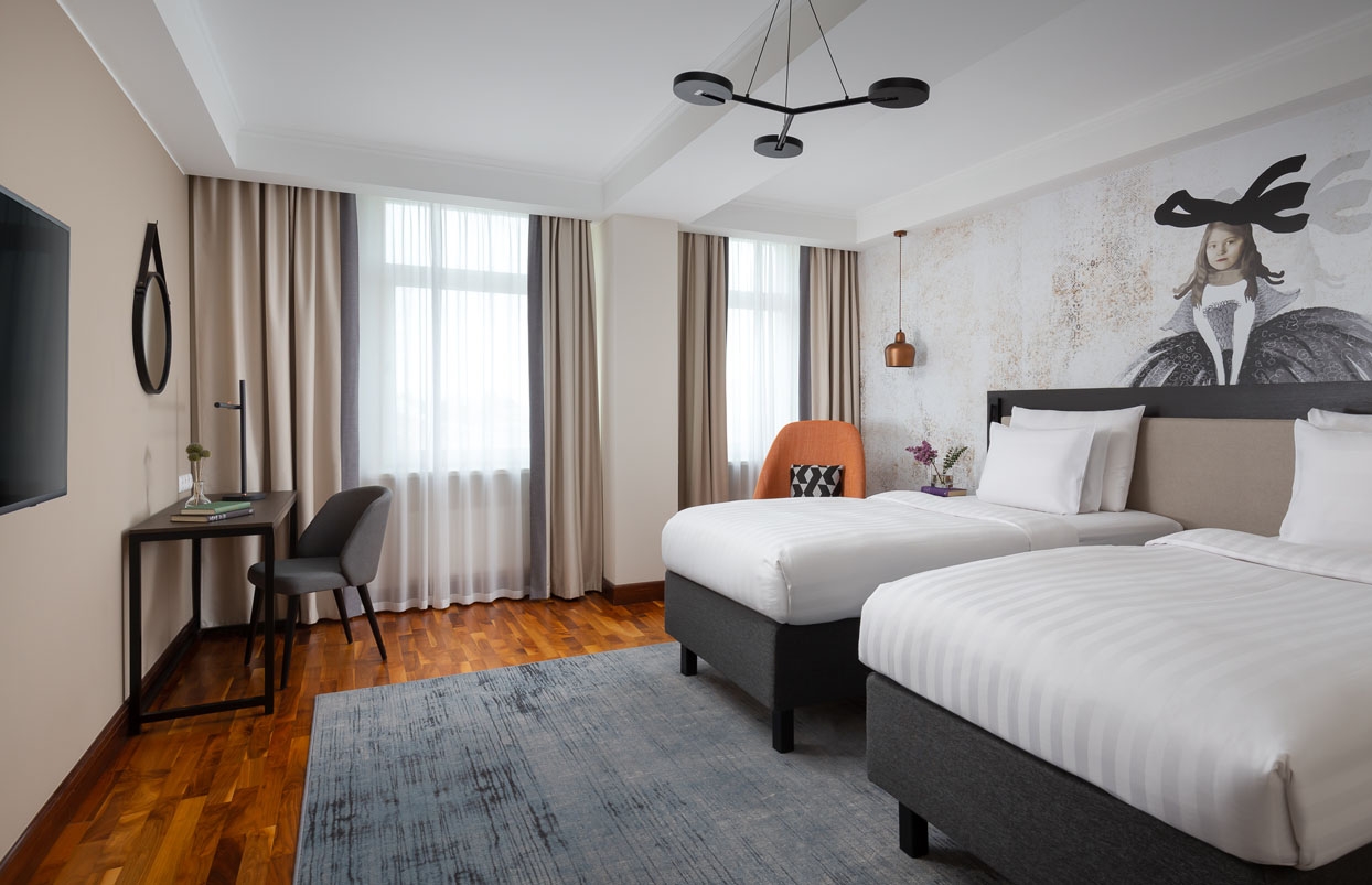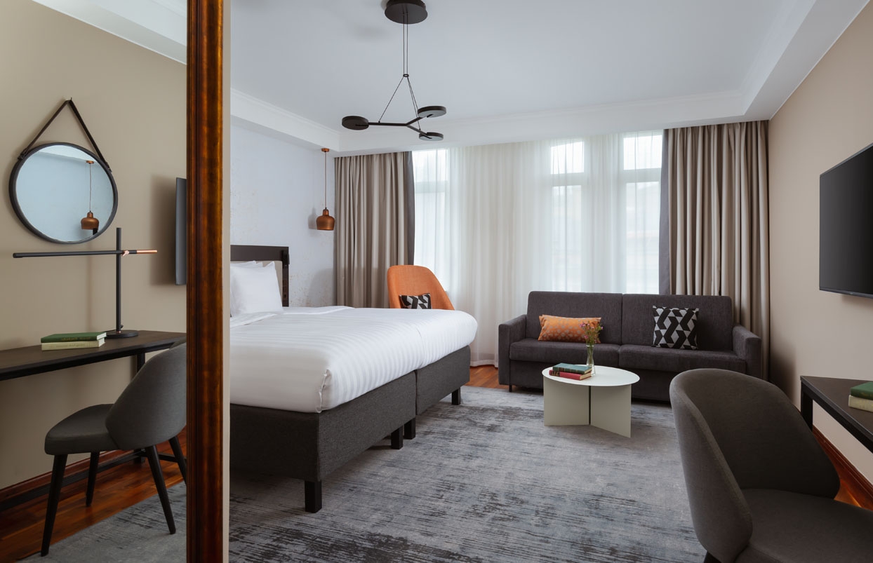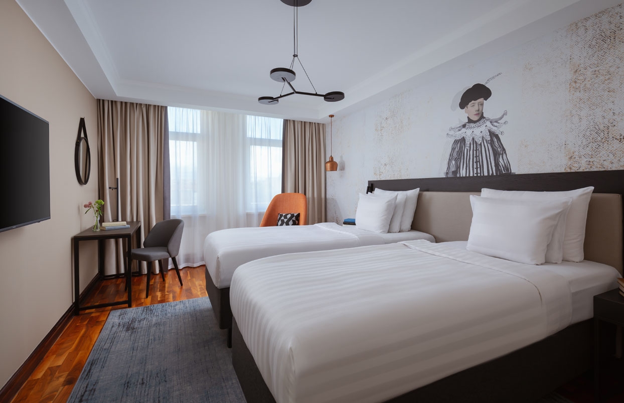 В номере все необходимое: два вида подушек (по запросу — антиаллергенные), мягкие тапочки и расширенная линия банных принадлежностей, швейный набор, гладильная доска с утюгом, Wi-Fi и рабочее пространство, спутниковое телевидение, чайная станция и мини-холодильник (мини-бар при депозите), минеральная вода и сейф.